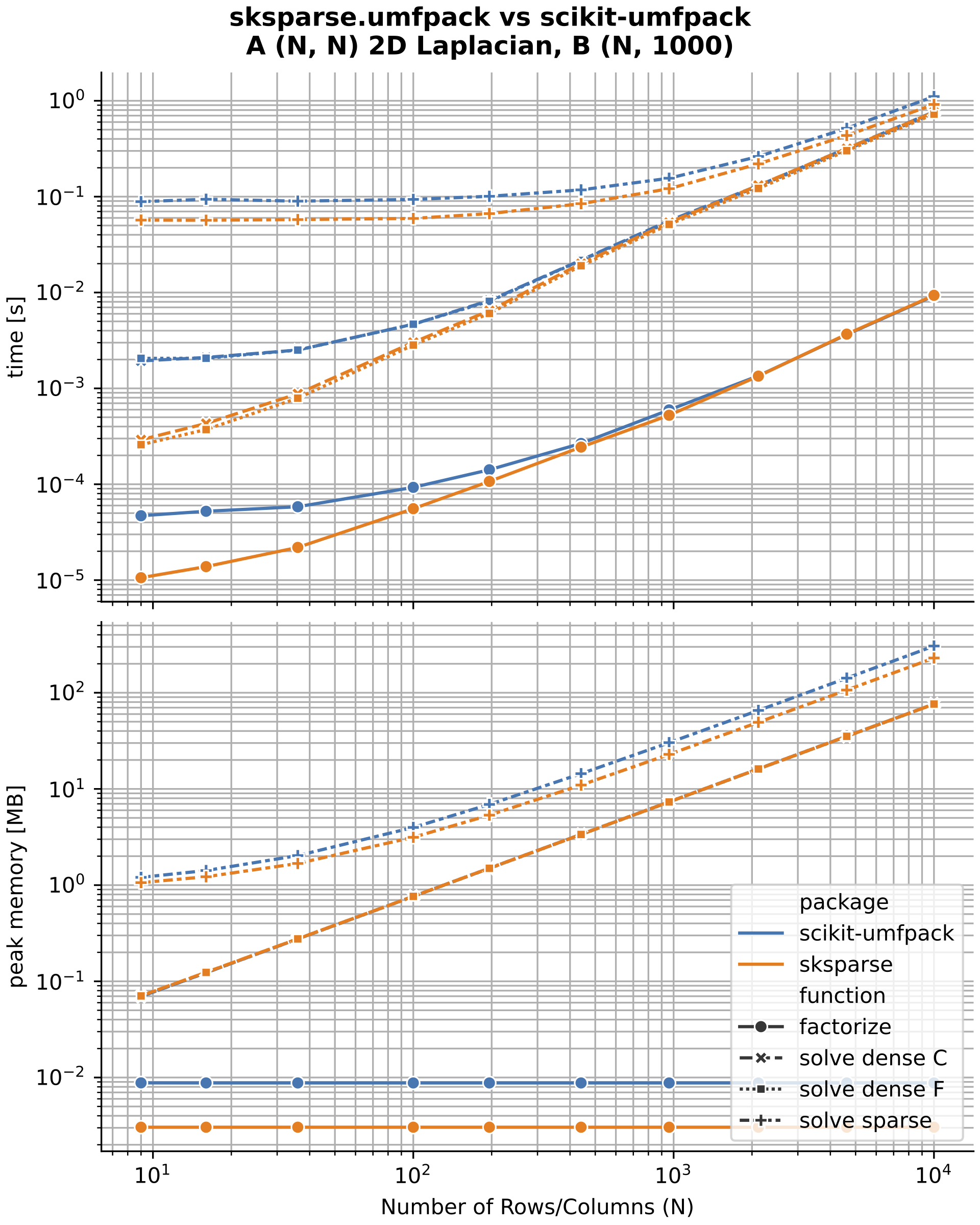 I compared the new scikit-sparse UMFPACK interface (sksparse.umfpack) to the existing scikit-umfpack project. The existing project uses a SWIG interface that is slower and uses more memory than the scikit-sparse Cython interface.