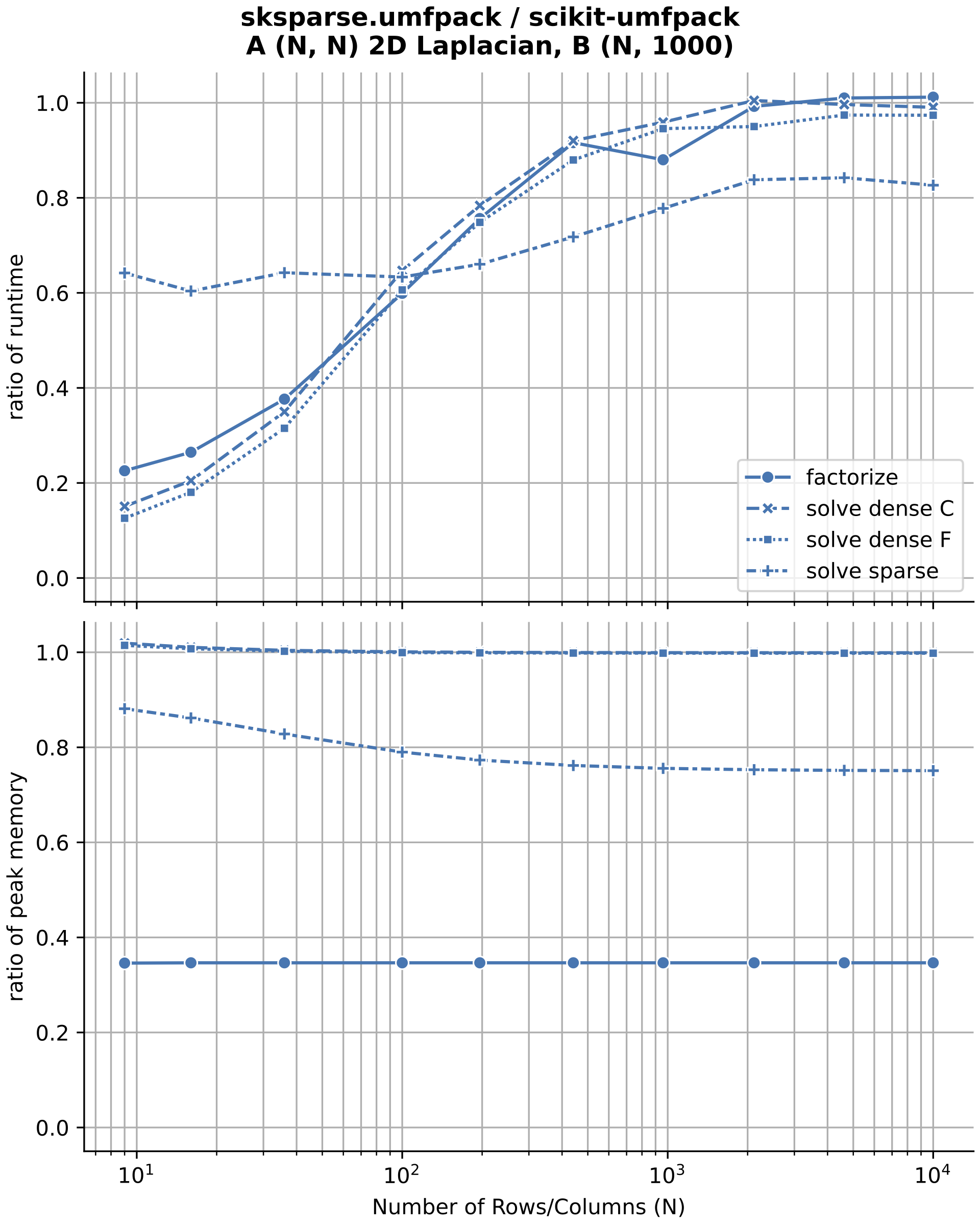 Note that the timing ratio for all functions is expected to approach 1.0 as matrices get larger, since the underlying SuiteSparse UMFPACK functions dominate the computation time vs. the python wrapper.