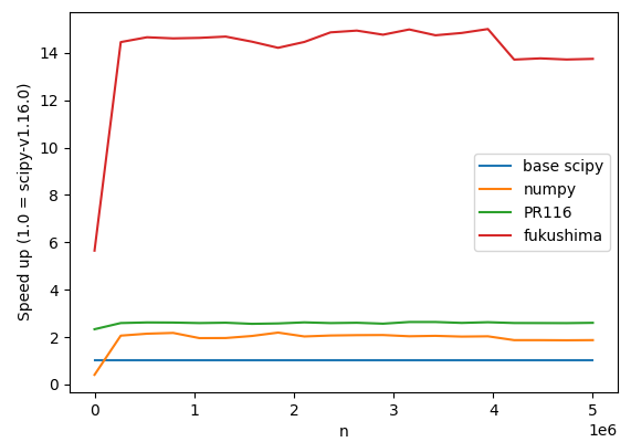 It is much faster than the method used in scipy. In a separate branch, I implemented it as a ufunc for scipy.special and observe a > 10x speed-up. Here is a comparison, where “base scipy” is scipy v1.16.0 installed from PyPI, “numpy” is our own numpy-based lambertw calculation, “PR116” is the double-precision implementation in xsf PR 116, and “fukushima” is Fukushima’s “high precision” method: